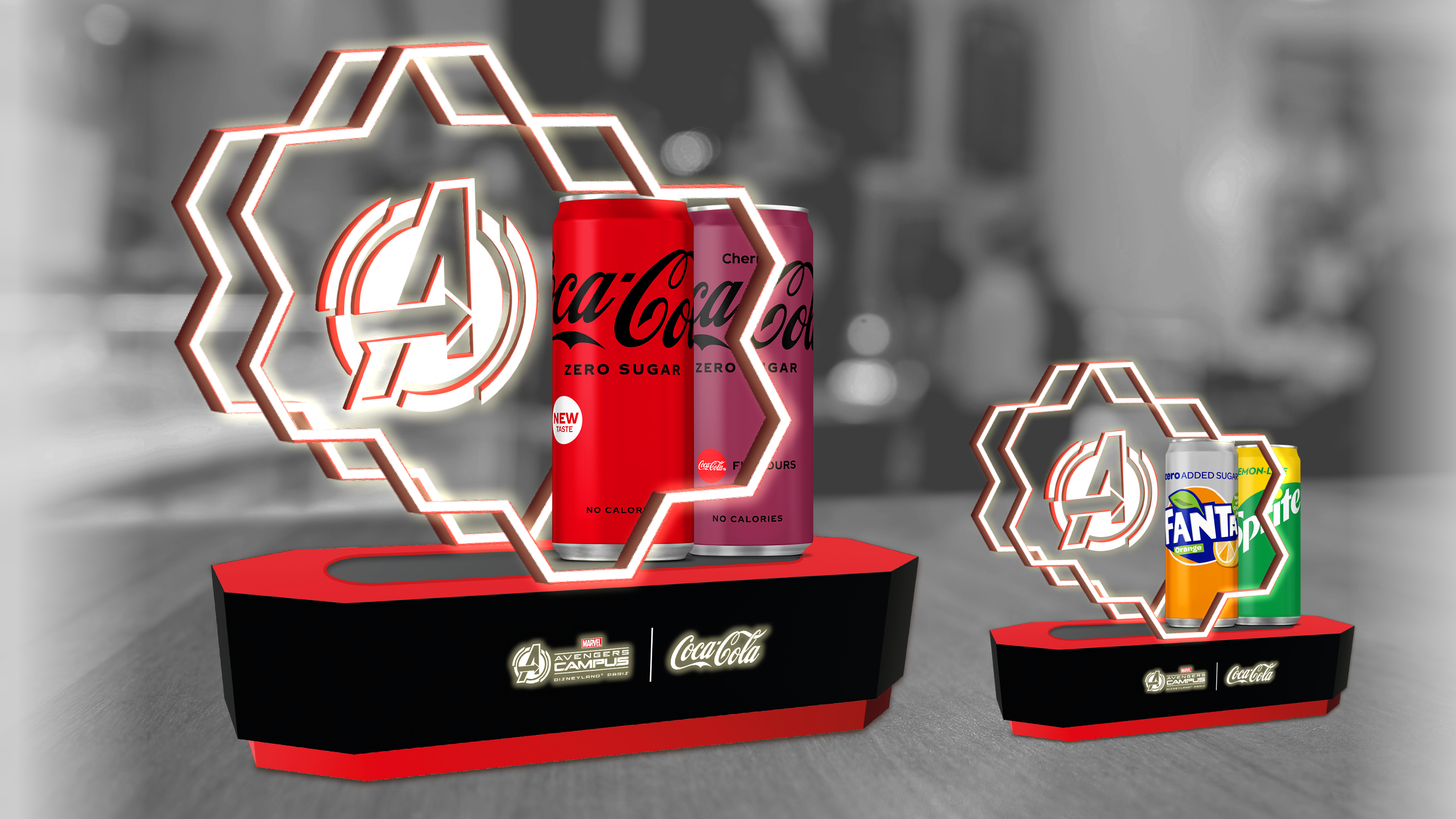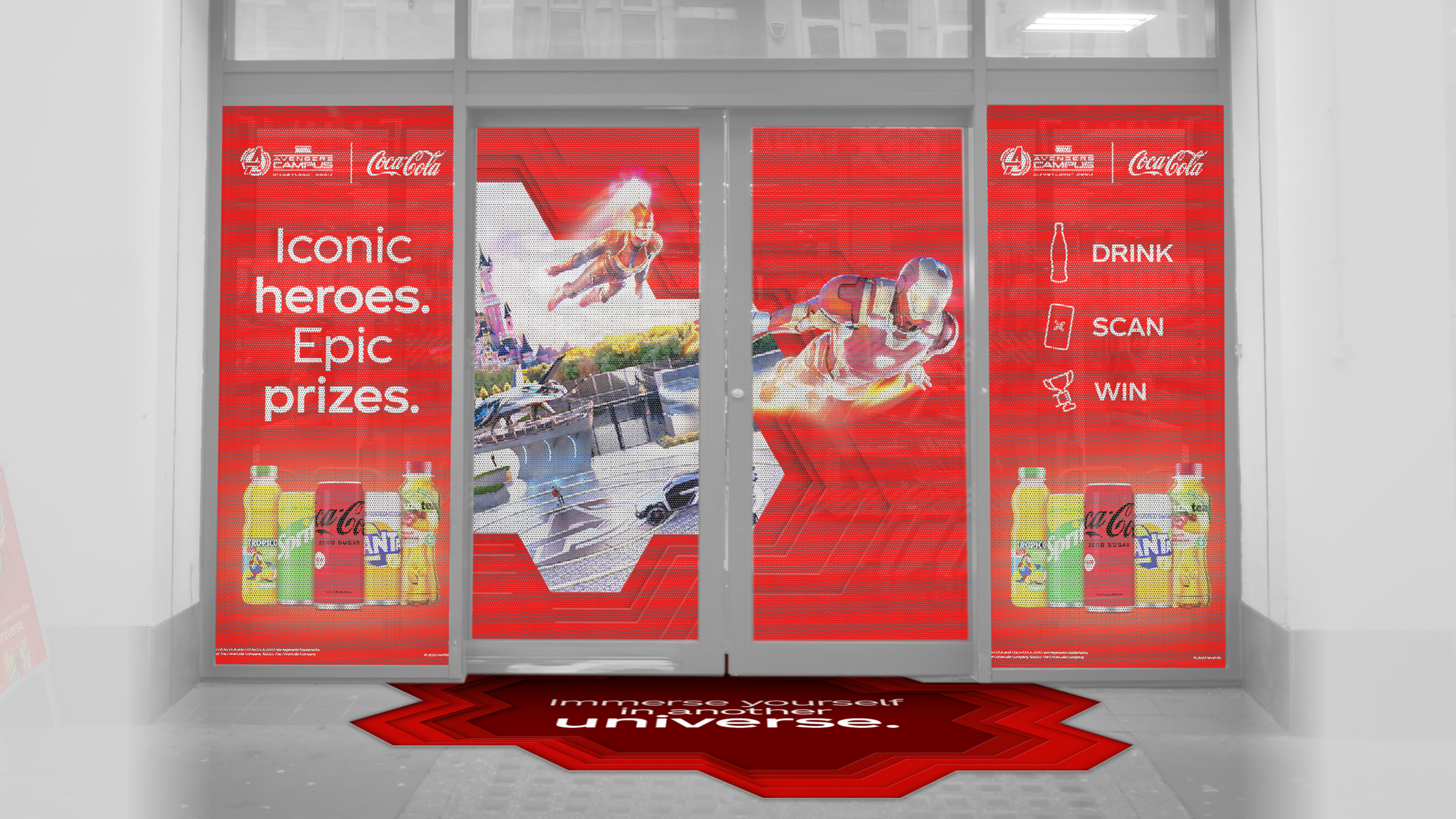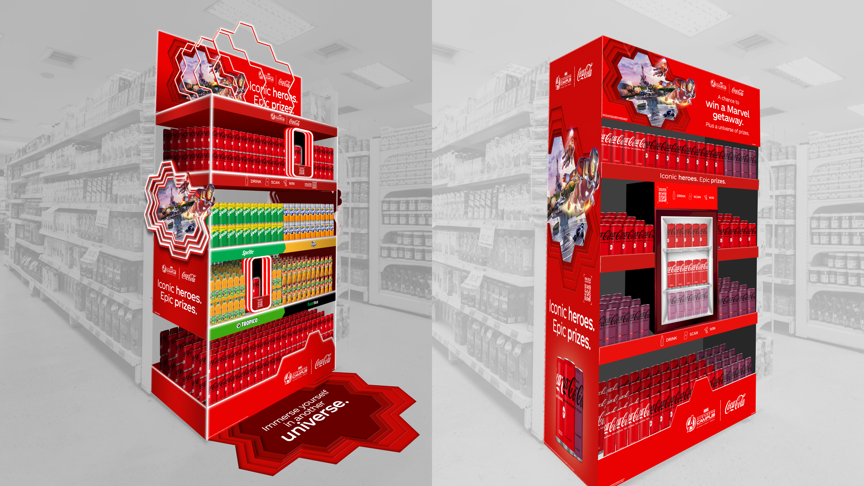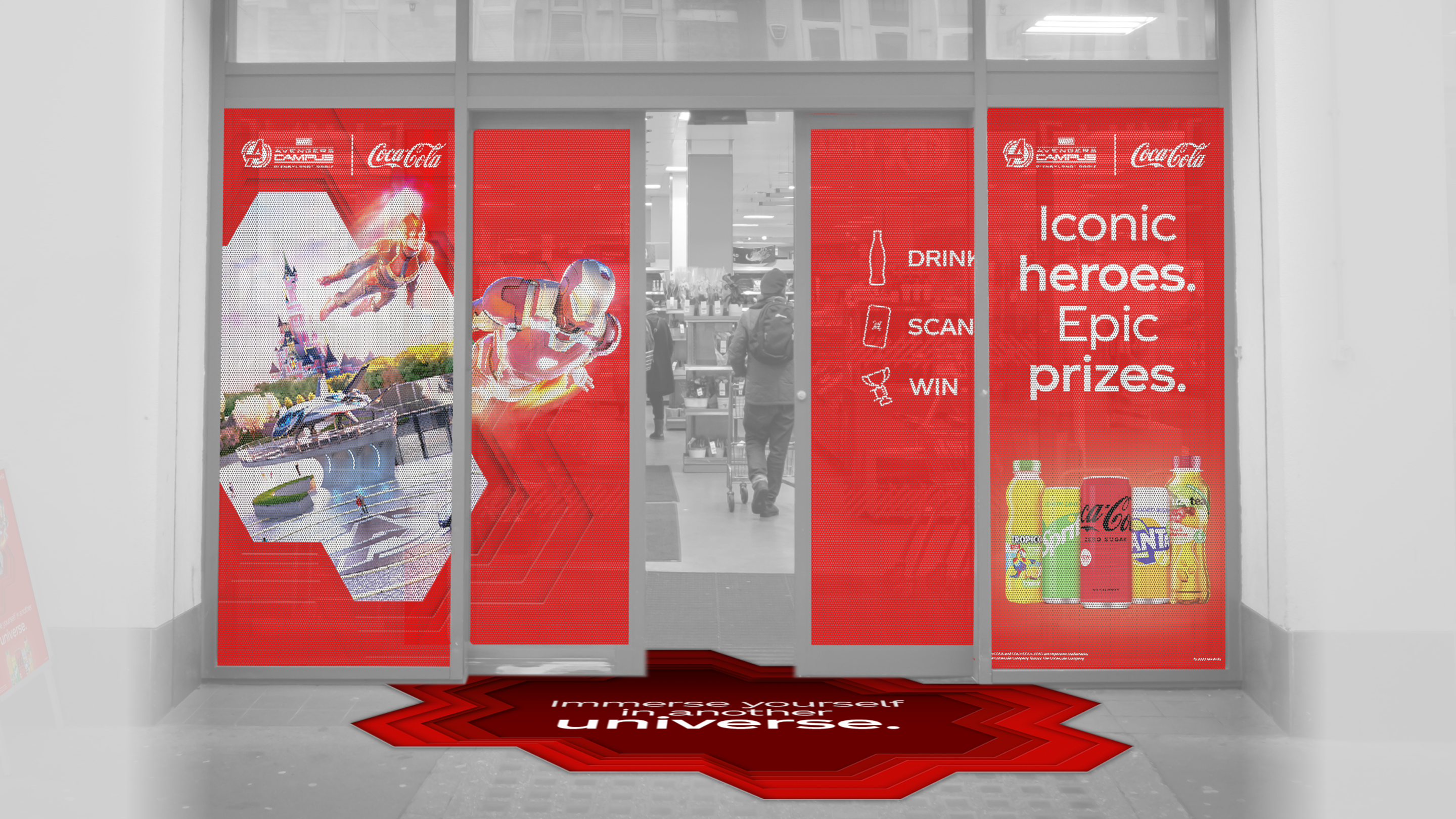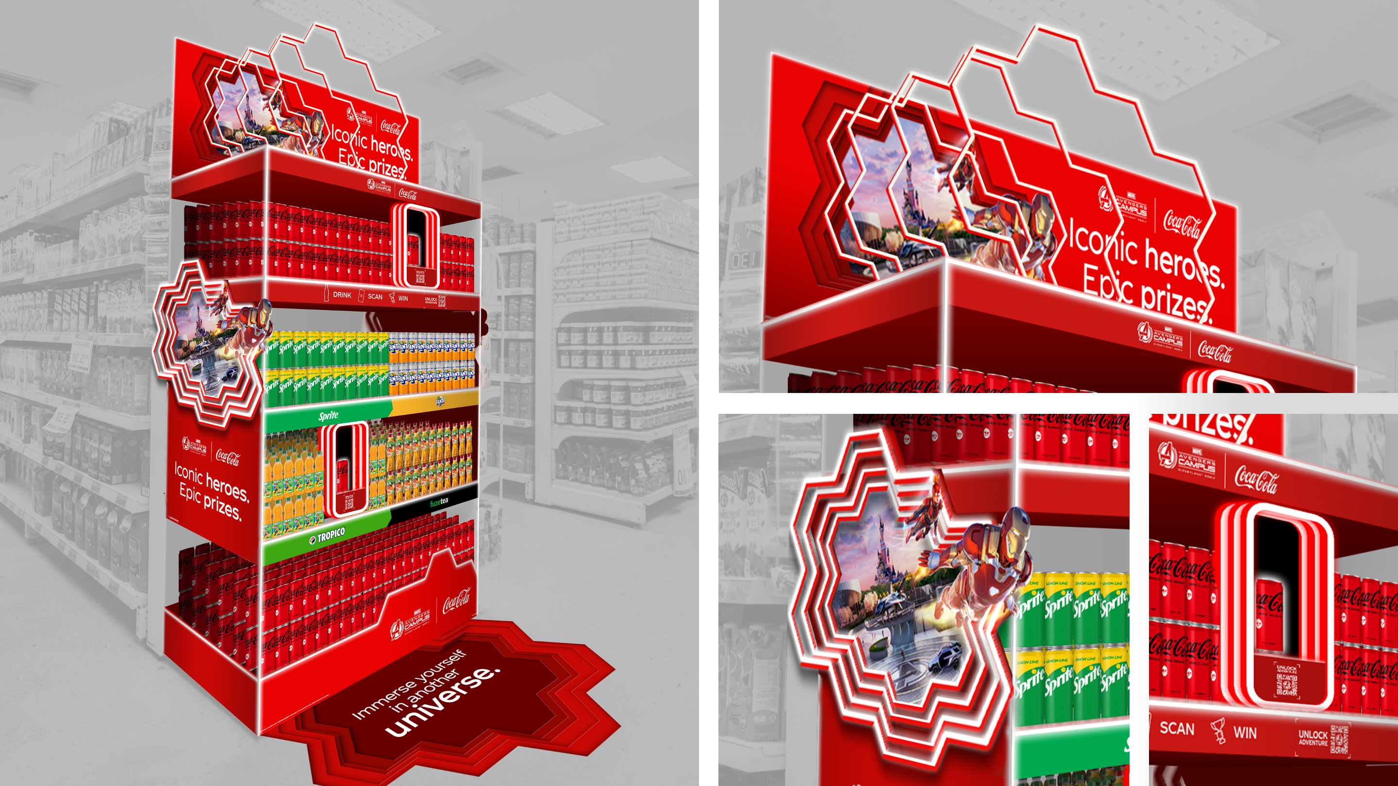 The challenge was to bring together the Coca-Cola and Marvels brand worlds. Creating a show-stopping campaign Visual ID and graphic language that could be expressed in 2D key visuals and touch points, and translate into the 3D and digital space, through immersive experiences, experiential, scalable displays and store activations.