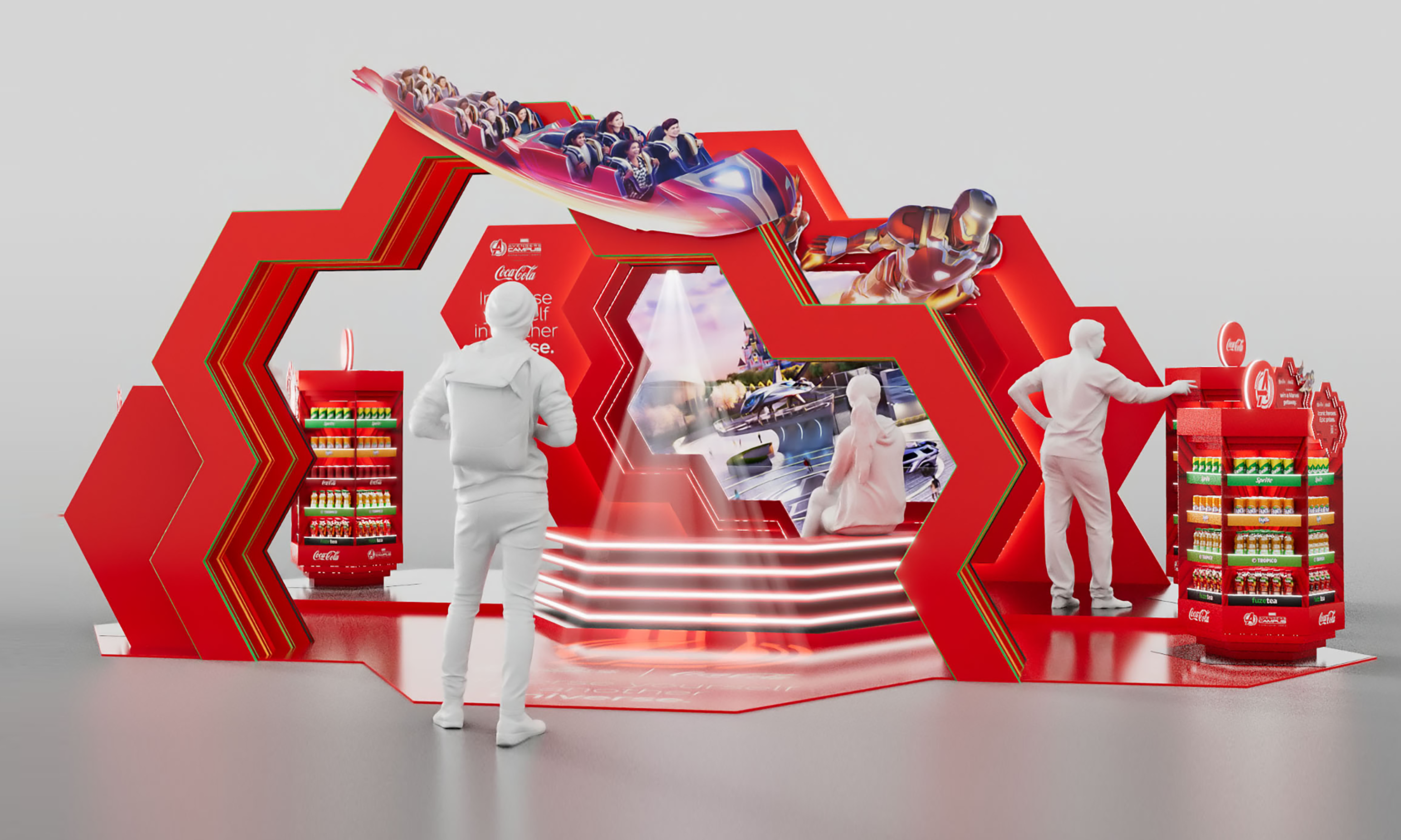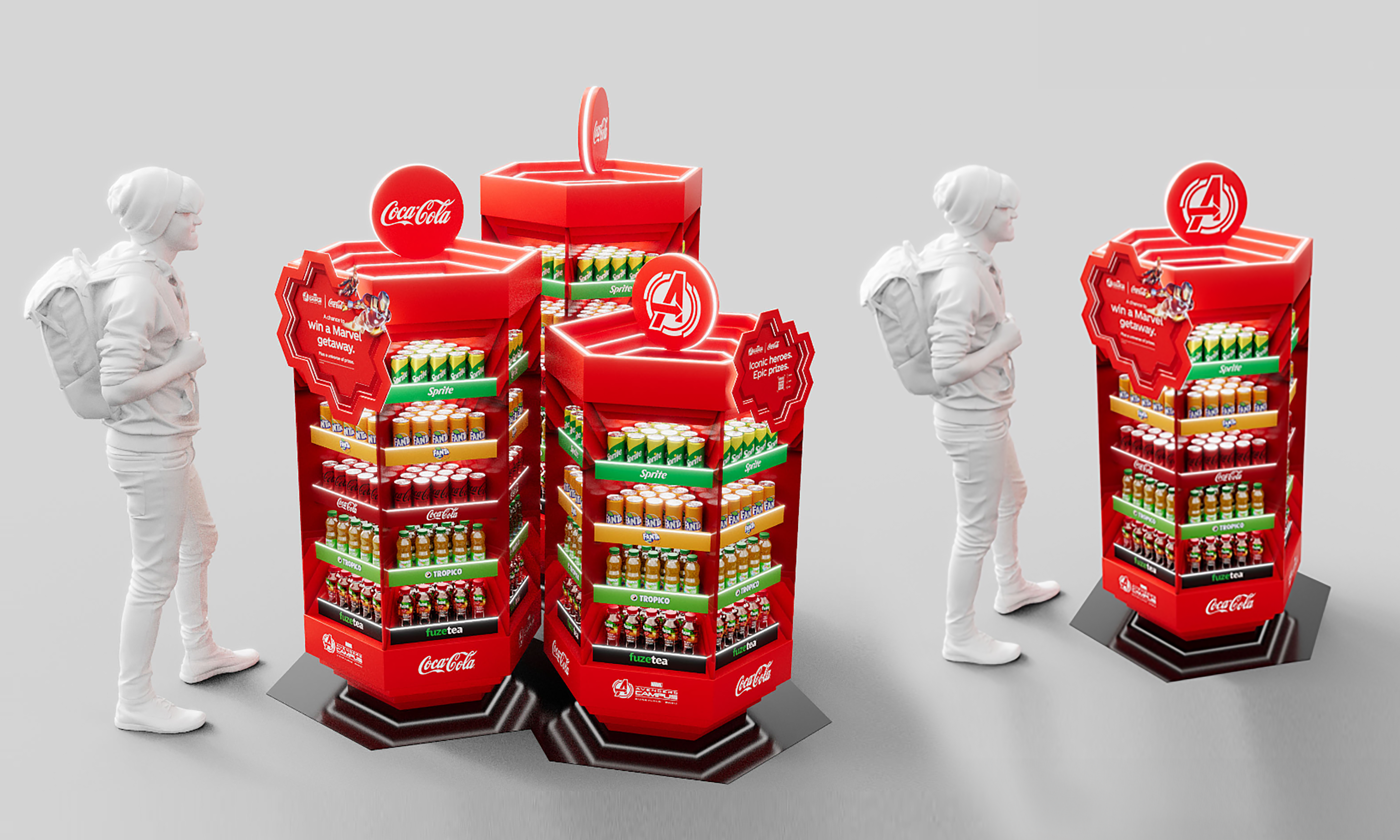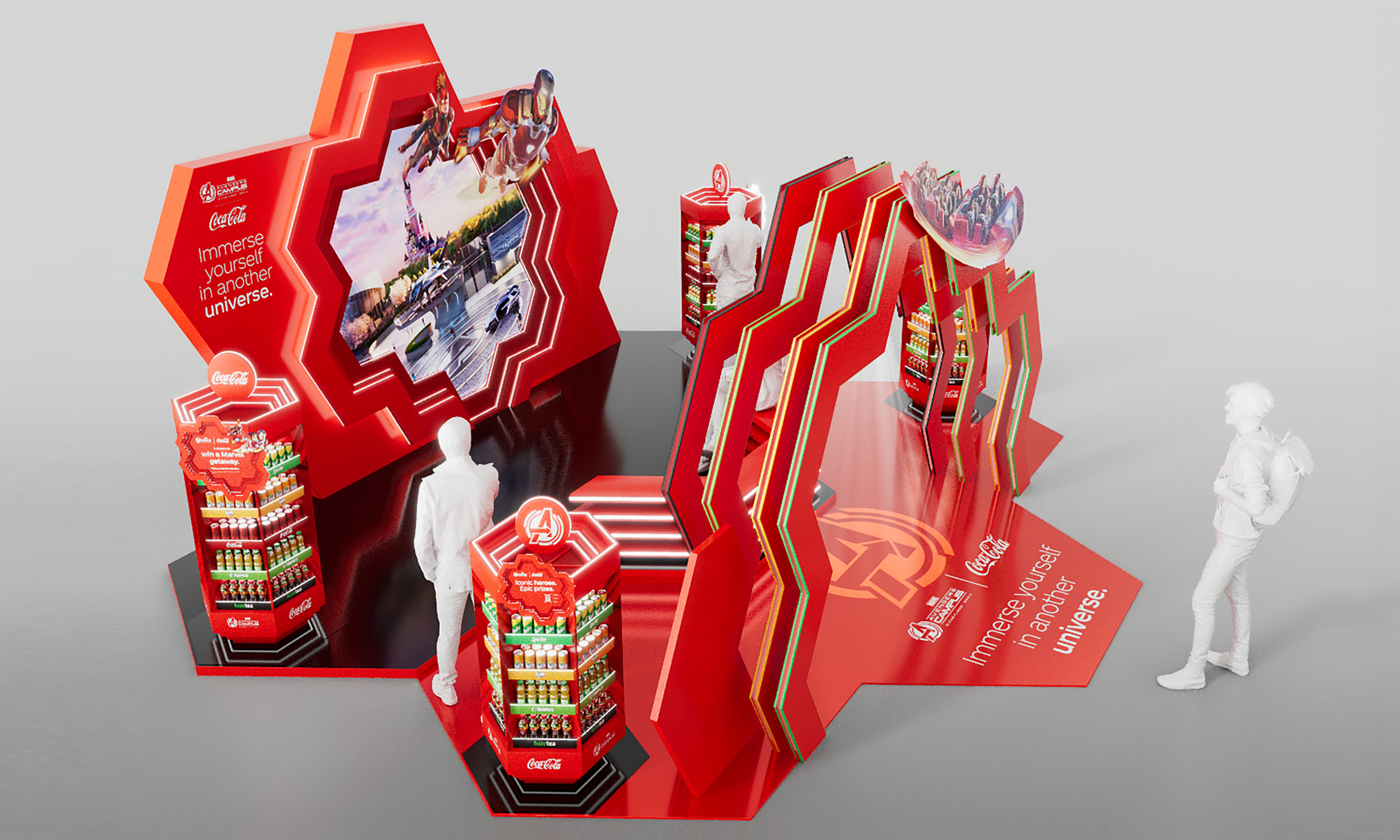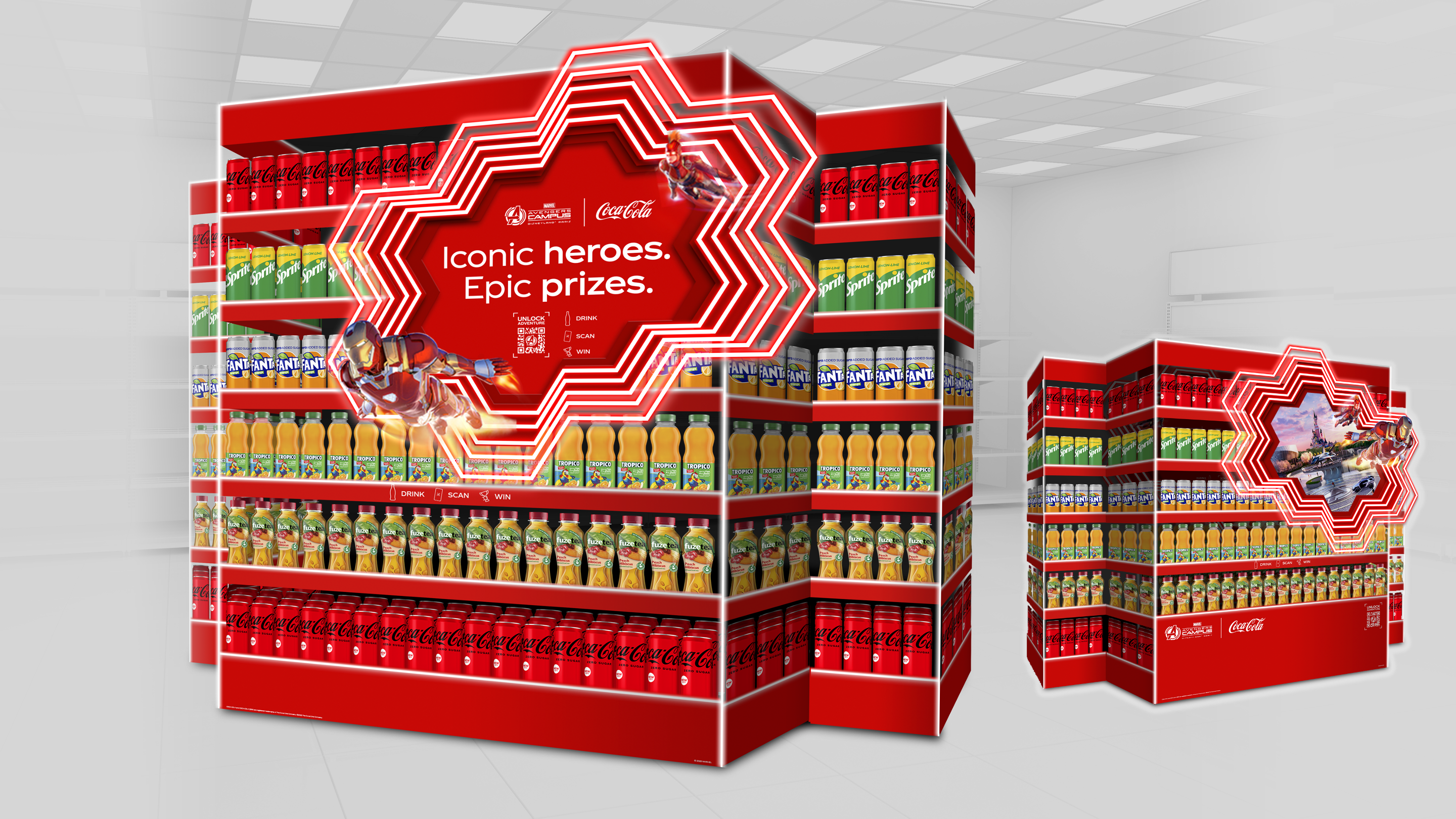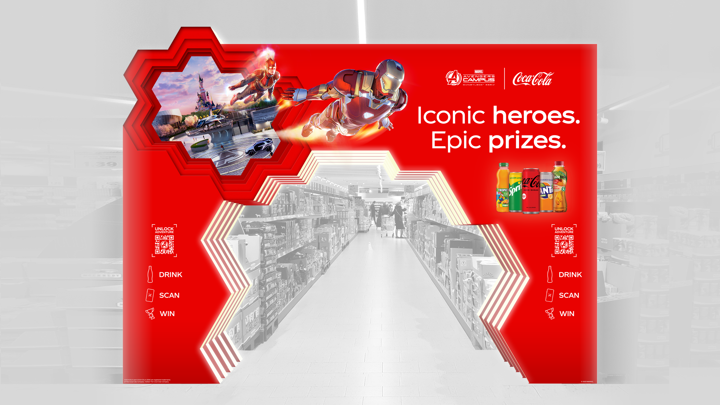 The challenge was to bring together the Coca-Cola and Marvels brand worlds. Creating a show-stopping campaign Visual ID and graphic language that could be expressed in 2D key visuals and touch points, and translate into the 3D and digital space, through immersive experiences, experiential, scalable displays and store activations.